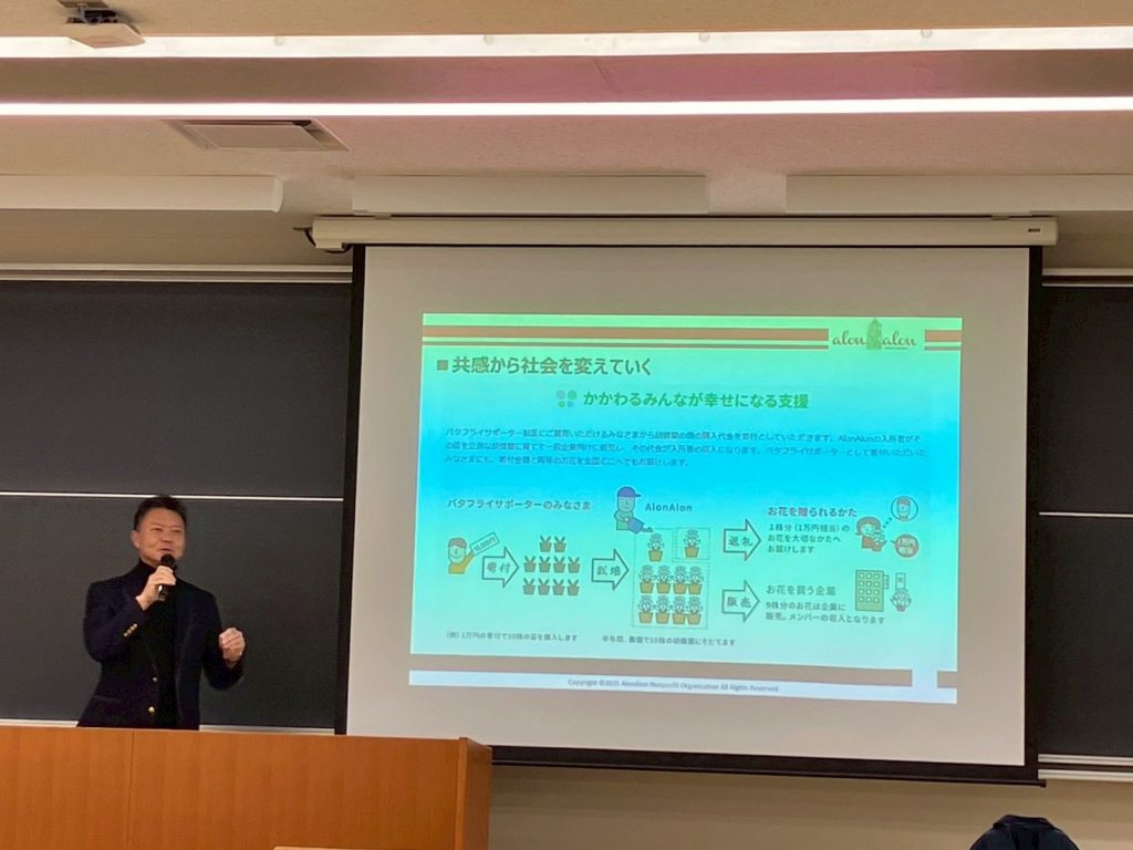 日本大学商学部にて講演 投稿日: 2025年12月18日 西武信用金庫寄付講座にて「ビジネスの力で社会課題を解決する」AlonAlonの事業モデルについてお話いたしました。その後、西武信用金庫の髙橋理事長、株式会社井口一世の井口社長、株式会社生活の木の重永社長とパネルディスカッション。学生にソーシャルビジネスの面白さが伝われば幸せです。